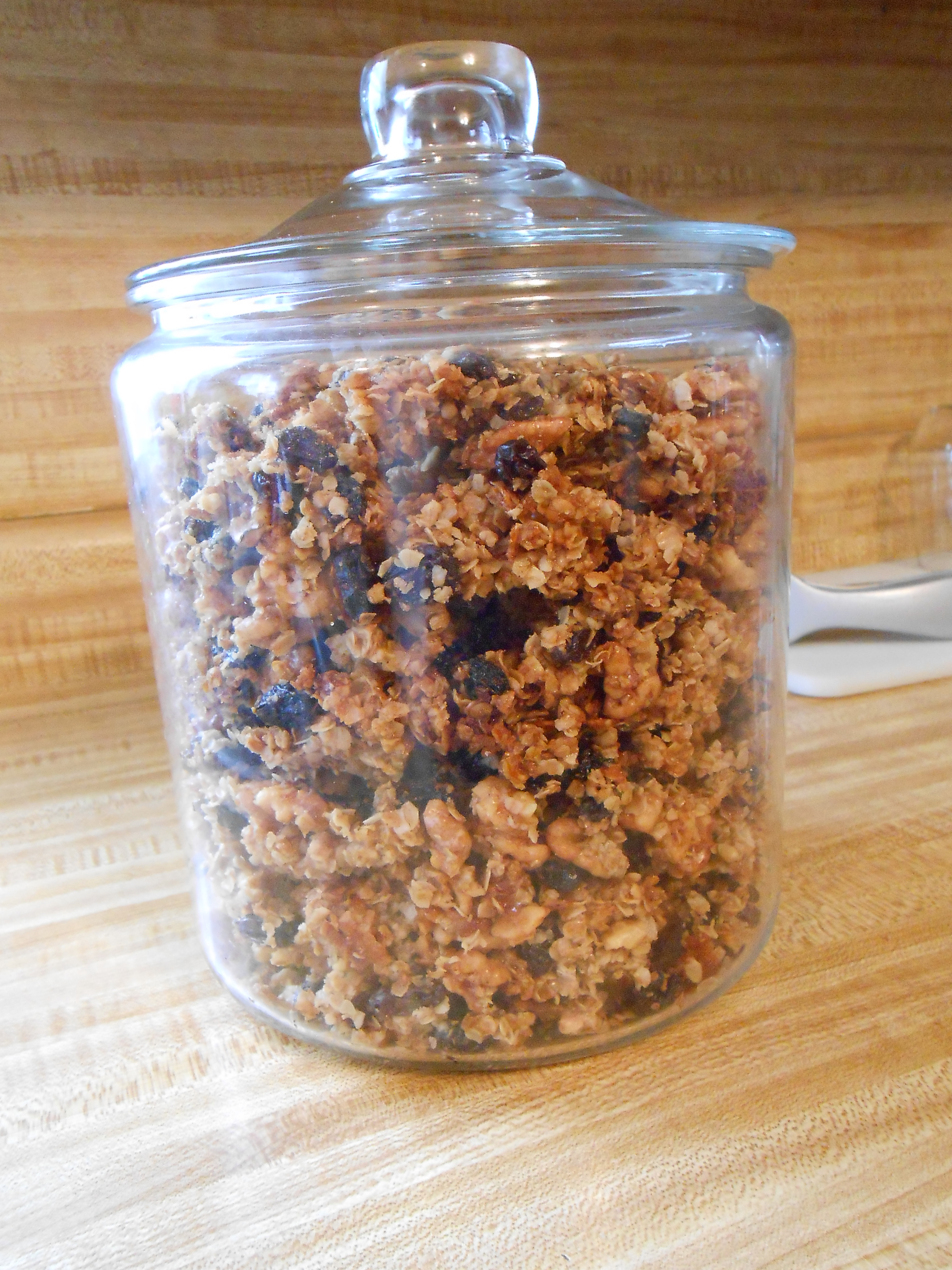 Anyway…. here is a picture of our cookie jar with my latest wonderful granola recipe in it.